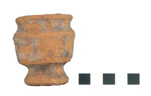 Bicchiere di piccole dimensioni in ceramica comune depurata, orlo estroflesso arrotondato, vasca carenata, piede a disco.\n