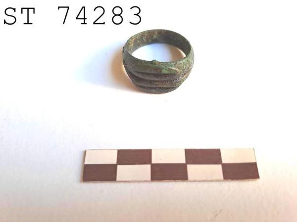 Anello digitale.\nVerga spessa bombata, che si allarga verso il castone. \nIl castone è composto da due piastre a mandorla. rilevate e separate tra loro da un solco. Ambedue i castoni hanno lo specchio ornato da un solco profondo che li riempie per la massima lunghezza.