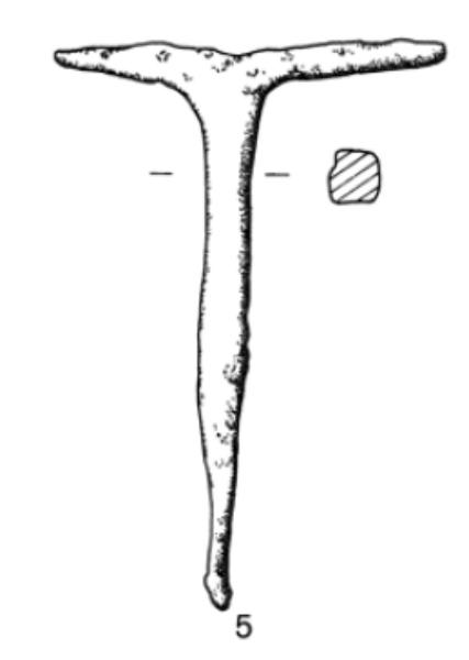 Elemento a T, sezione quadrangolare, estremità desinenti a punta.\nSorta di gancio, noto da numerosi ritrovamenti di età romana, che si ritiene utilizzato prevalentemente per aiutare a conservare in verticale tegole perforate e sovrapposte. Un elemento tra due tegole adiacenti. Non sono esclusi altri usi.