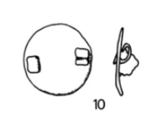 Disco in lamina.\nSulla faccia posteriore due occhielli in lamina, disposti lungo il bordo ed in asse tra loro, inseriti nel disco e fissati ribadendone le estremità fuoriuscenti sull'altra faccia.\nDovrebbe trattarsi del piano di fondo di una fibula a disco (Scheibenfiebeln), sopra cui applicare la decorazione, generalmente costituita da una seconda lamina in materiale più prezioso.
