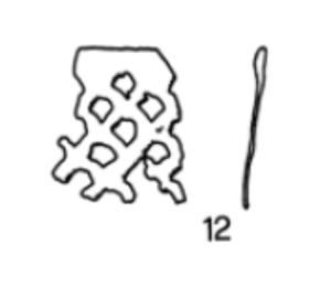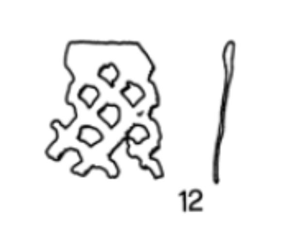 Frammento di lamina decorata a traforo.\nMaggiore spessore lungo il bordo.