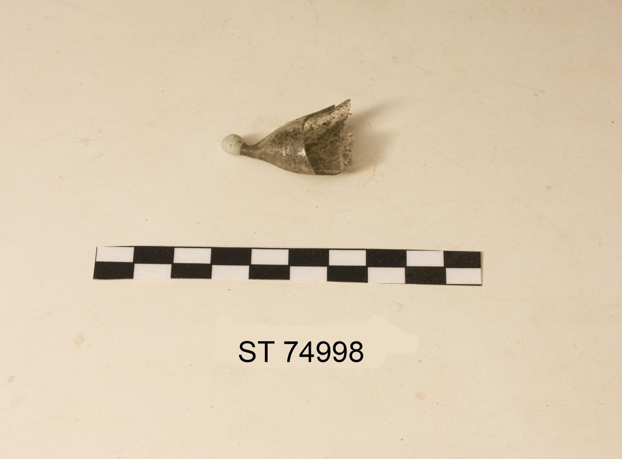 Frammento di fondo, deformato dal calore fino ad assumere una sezione ellittica; sembra attribuibile ad un'ampollina (lucerna) a terminazione inferiore conica che si conclude con un piccolo bottone globulare.\nVetro di colore verdino chiaro, che diventa biancastro nella parte inferiore.