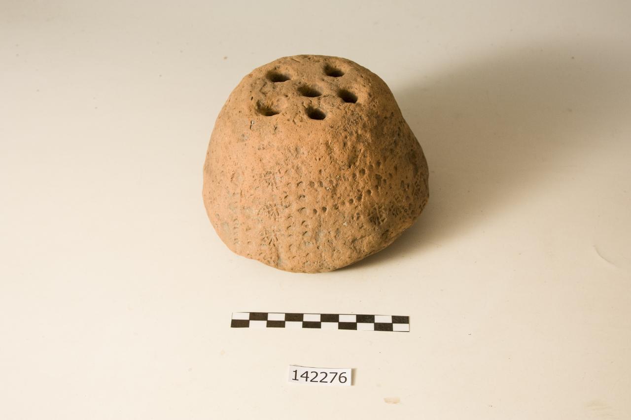 Pane di forma tozza, vagamente troncoconica.\nSulla faccia superiore sono presenti sei fori (uno al centro e cinque attorno ad esso) del diametro di 1cm c.ca, profondi da 2.4 a 4cm con andamento non perfettamente verticale, così che infilandovi dei bastoncini essi assumono posizioni leggermente divergenti tra loro.\nLa superficie dell'oggetto è decorata da una serie di stampiglie ad asterisco disposte in parte su file verticali separate da file di puntini triangolari o squadrati, in parte su file orizzontali, ad indicare un'applicazione manuale poco attenta alla regolarità del risultato decorativo.