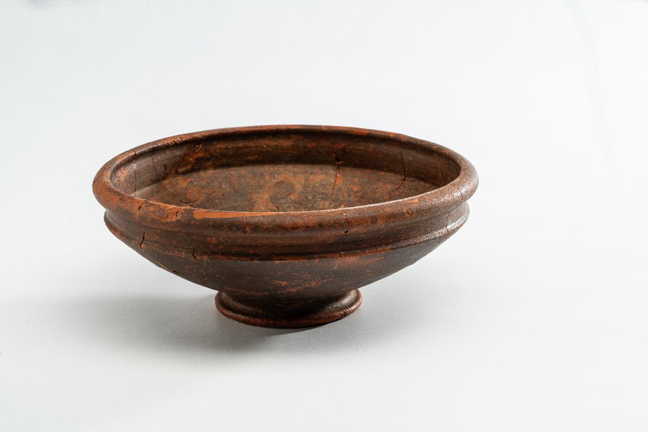 Ciotola in ceramica comune di qualità fine, con corpo profondo, alta carenatura, parete sinuosa con orlo ispessito a cordone. All'interno e all'esterno delle pareti conserva tracce di un rivestimento argilloso bruno-nerastro opaco.