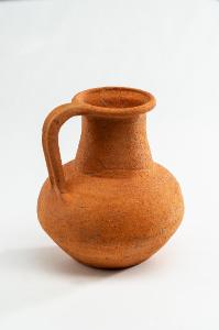 Brocca in ceramica comune con alto collo svasato, orlo distinto, corpo ovoide schiacciato, fondo piano. Ansa a nastro con depressione centrale, innestata sull'orlo e sul ventre.