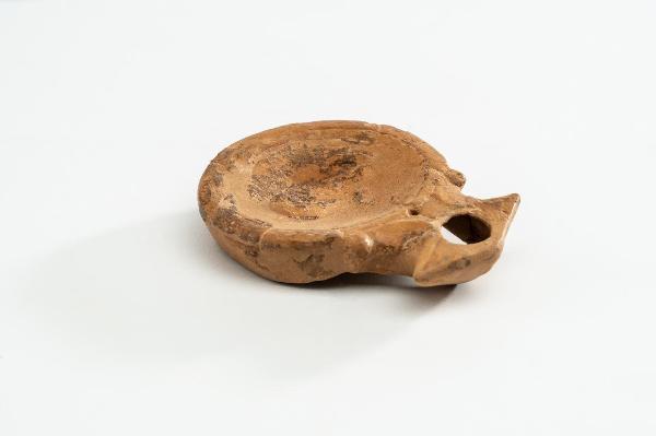 Lucerna a volute e becco angolare, con spalla arrotondata distinta dal disco da due solcature concentrica. Disco concavo, decorato con motivo a rilievo. Corpo profondo con profilo arrotondato, fondo piano. Motivo decorativo a rilievo raffigurante un animale.