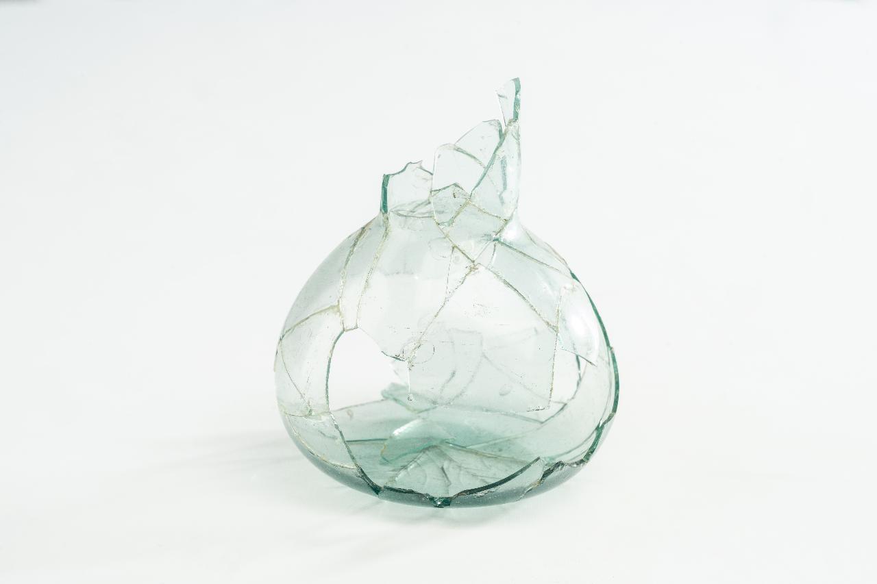 Grande balsamario a corpo schiacciato, mancante dell'orlo e della parte superiore del collo. Colore azzurro, trasparente.