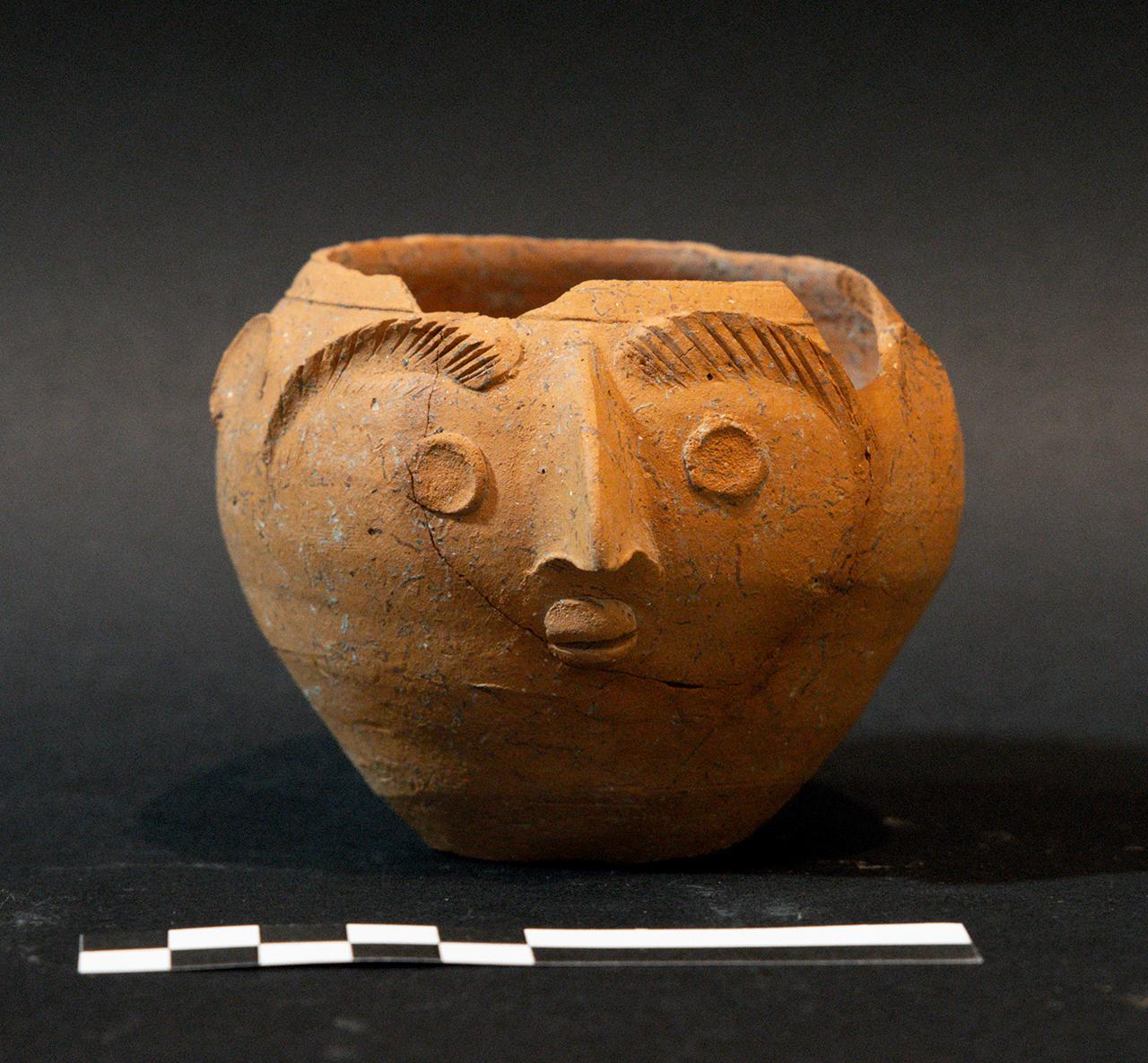 Olletta a corpo ovoide e orlo rientrante, sottolineato all'esterno da una solcatura, orlo semplice. Sulla superficie esterna sono collocati apporti di argilla sagomati affinchè mostrino un volto umano: due orecchie piccole e non molto rilevate, sopracciglia fortemente marcate caratterizzate da tratti incisi paralleli tra loro e obliqui rispetto all'andamento della sopracciglia, naso applicato a partire dal mezzo delle sopracciglia, arcuato e appuntito, occhi circolari in rilievo impresso, bocca realizzata tramite l'apporto di un piccolo grumo di argilla suddiviso in due da una solcatura a imitare le labbra. Privo di rivestimento. Fondo piano.