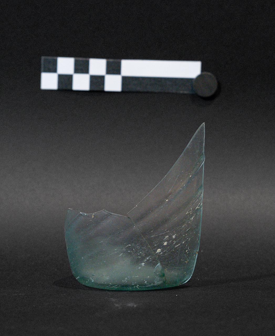 Fondo di bicchiere in vetro verde-azzurro, trasparente. Corpo troncoconico, fondo apodo umbilicato. Fascio di linee in rilievo ad andamento spiraliforme sul corpo.