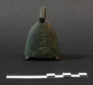 Tintinnabulum a forma piramidale a base rettangolare con lati arcuati. Piccolo suppporto ad un vertice arcuato rimasto. Vertice superiore smussato; arcuate verso l'alto. Presa a forma di losanga con foro ovale.