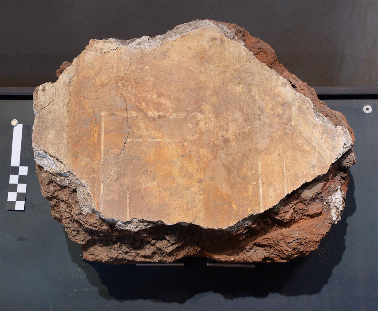 Frammento di intonaco dipinto, eseguito su muratura in argilla cruda ancora conservata sul suo retro. Mostra evidenti tracce di incendio su tutta la superficie pittorica, gravemente alterata nei suoi valori cromatici. Raffigura parte di una lesena.
