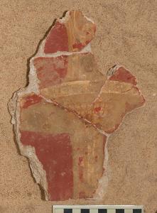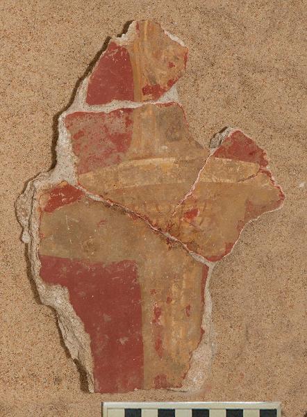 Frammento con zona inferiore di candelabro dorato su campo rosso. Il motivo decorava la zona mediana dell’atrio. \n