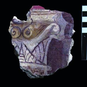La decorazione è relativa all’anticamera del cubiculum detto Stanza di Arianna e rappresenta il capitello della colonna che fa da quinta architettonica per il quadro figurato.