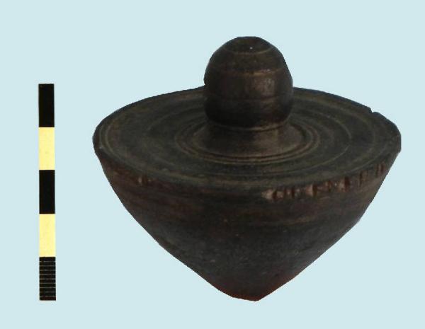 peso in piombo a forma di solido di rivoluzione, con estremità inferiore appuntita e priva di decorazione; parte superiore piana con pomello caratterizzato da foro passante.