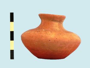 vasetto miniaturistico apodo con corpo biconico, spalla arrotondata, collo stretto a profilo sinuoso, labbro estroflesso.