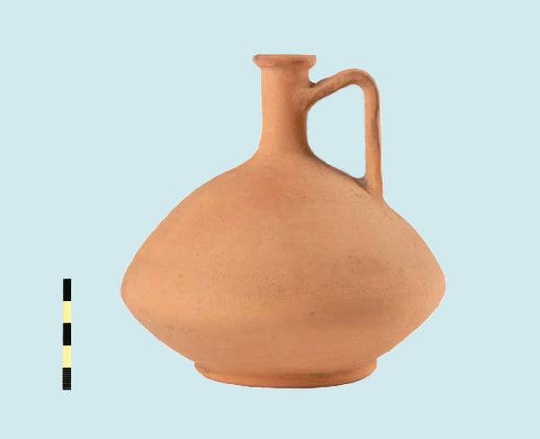 olpe a corpo piriforme con ventre ribassato e carena arrotondata; ansa a nastro costolata impostata subito sotto l'orlo e sulla spalla, piede a disco.