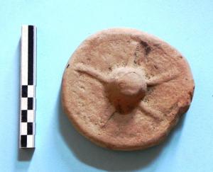 tappo d'anfora di forma circolare a profilo liscio e con presina troncoconica centrale; sulla faccia superiore a dividerne la superficie cinque costolature rilevate.