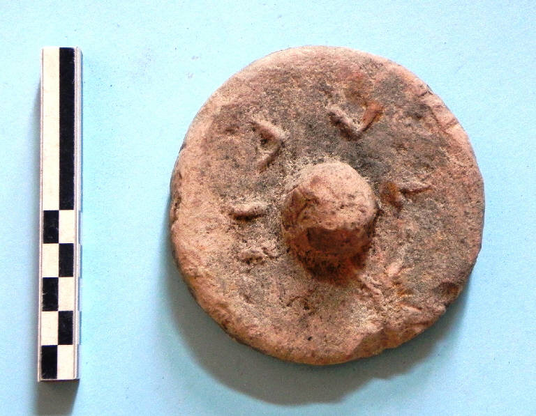 tappo d'anfora di forma circolare a profilo liscio e con presina cilindrica centrale. Sulla superficie piccoli segni a rilievo: due segmenti paralleli e tre V.