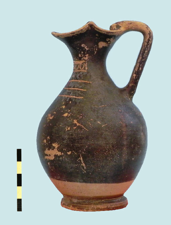 oinochoe in vernice nera, con decorazione incisa e sovraddipinta (Stile di Gnatia). Profilo continuo con corpo globulare, spalla inclinata e labbro trilobato; piede ad anello sagomato, ansa a sezione semicircolare impostata dall'orlo alla spalla.