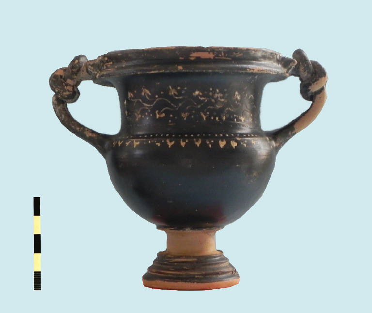 craterisco in vernice nera con decorazione sovraddipinta; orlo a sezione triangolare, piede modanato e anse impostate dal collo alla spalla caratterizzate dalla presenza del "nodo di Eracle;