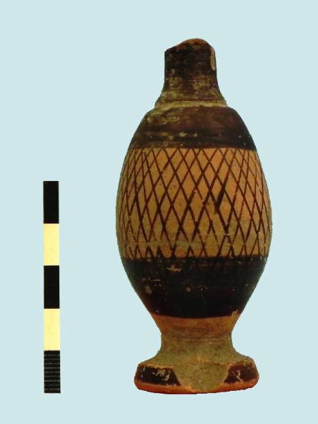 lekythos con corpo ovoide, collo sottile e dritto, raccordo cilindrico e piede a disco rilevato.