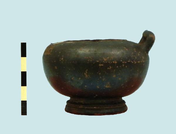 piccolo stamnos in vernice nera, con corpo sferoidale schiacciato, piede sagomato con fondo convesso, anse impostate verticalmente sulla spalla.