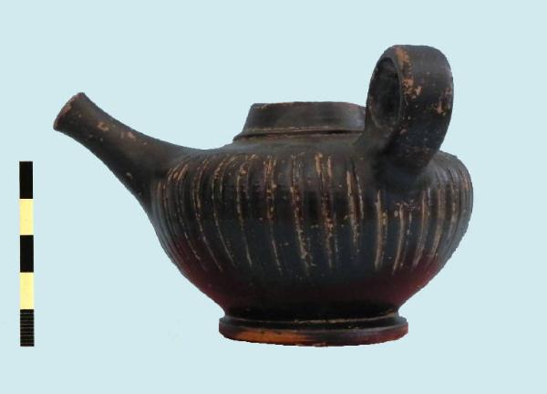 guttus in vernice nera con lungo beccuccio, larga ansa a nastro impostata dalla spalla al corpo; nella parte superiore disco con un foro centrale e quattro periferici; corpo baccellato; piede a disco.