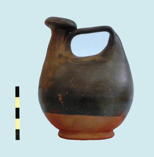 askos in vernice nera; corpo otriforme, ansa a nastro orizzontale, corto collo cilindrico con orlo assottigliato; piede a disco.