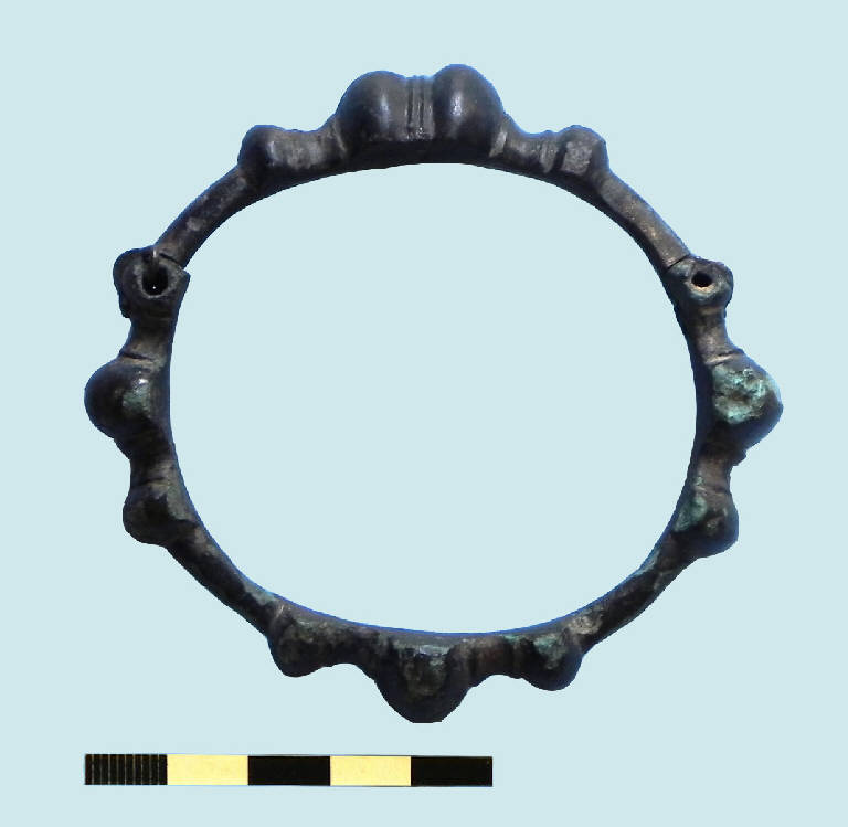 armilla in bronzo realizzata a fusione, formata da due semicerchi agganciati l'uno all'altro mediante due cerniere.