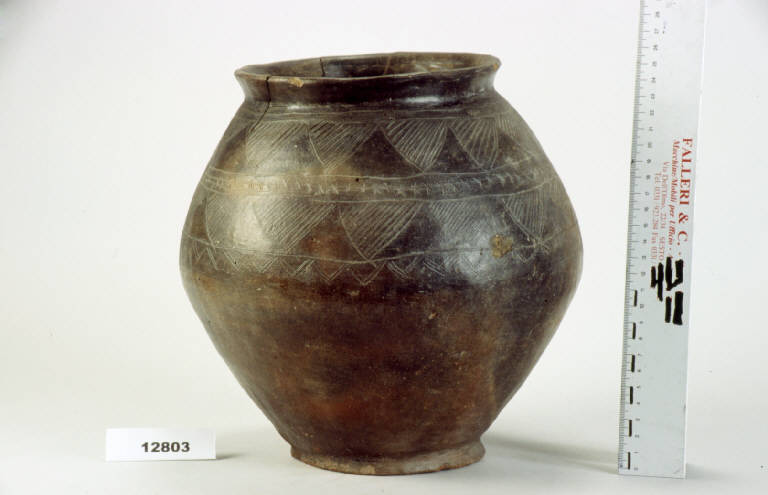 Orlo estroflesso, corpo biconico a spalla tonda, basso piede a disco. Sul corpo decorazione a due file di denti di lupo graffiti intercalati da una banda decorata a X. Sotto, decorazione a triangoli graffiti a doppia linea e metope.