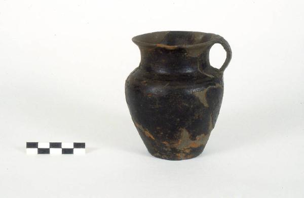 Orlo leggermente estroflesso, basso collo cilindrico, spalla arrotondata, corpo fortemente rastremato verso il basso, fondo piano. Tra orlo e spalla s'imposta un'ansa ad orecchia a sezione ovale.Superficie trattata a stralucido.