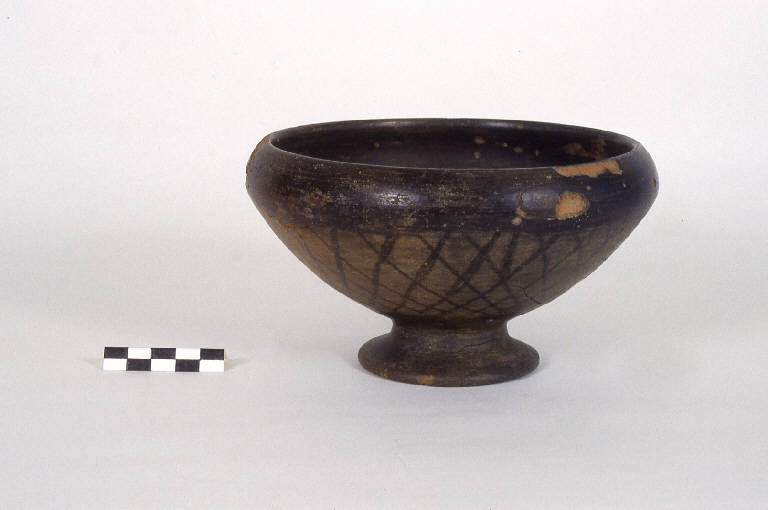 Orlo introflesso, vasca troncococnica, basso piede svasato. Decorazione a stralucido: sulla vasca esterna una fascia a reticolo.