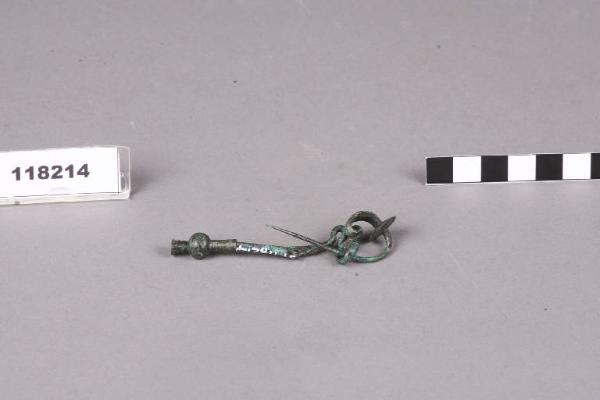 Fibula ad arco serpeggiante, staffa allungata verso un elemento cilindrico a fitta zigrinatura continua.