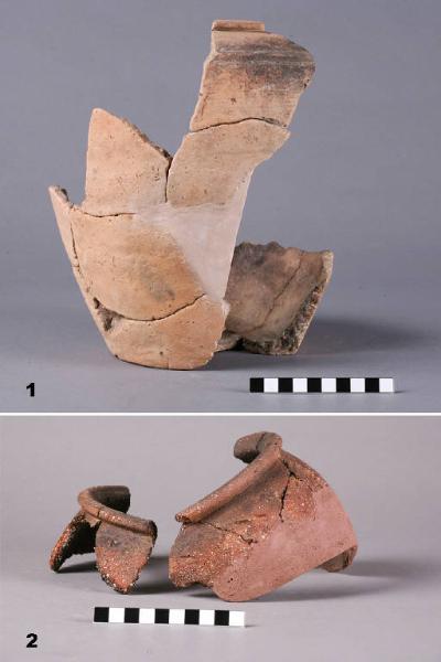 1) Olla situliforme con orlo a cordone schiacciato\n2) Olla globulare con orlo cordonato