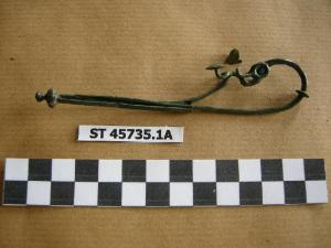 Fibula a drago con due coppie di antenne desinenti a dischetto: la seconda coppia parte da dischetti fissati all'arco con un ribattino; disco fermapieghe piccolo, staffa allungata con sezione a "V" e terminazione costituita da elemento lenticolare seguito da elemento biconico.