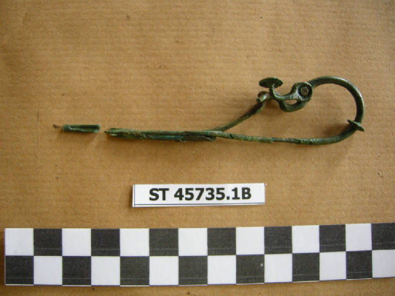 Fibula a drago con due coppie di antenne desinenti a dischetto: la seconda coppia parte da dischetti fissati all'arco con un ribattino; disco fermapieghe piccolo, staffa allungata.