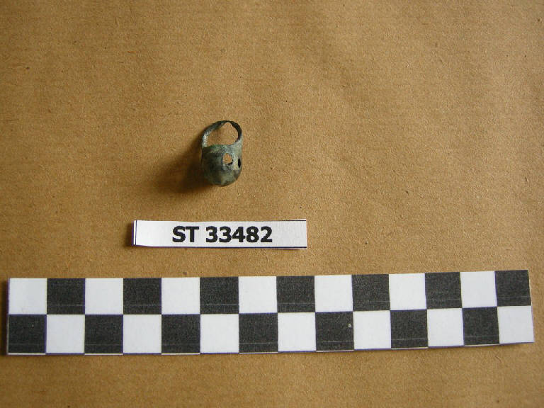 Pendaglio a cestello con fondo arrotondato e spalle smussate (varietà B tipologia de Marinis), due forellini ne attraversano il corpo.