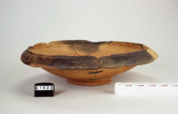 Patera poco profonda, orlo esoverso e ripiegato verso il basso, piede basso troncoconico