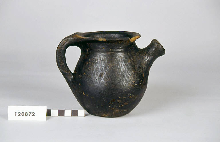 Brocca con beccuccio versatoio, corpo a forma di doppio cono, orlo estroflesso.