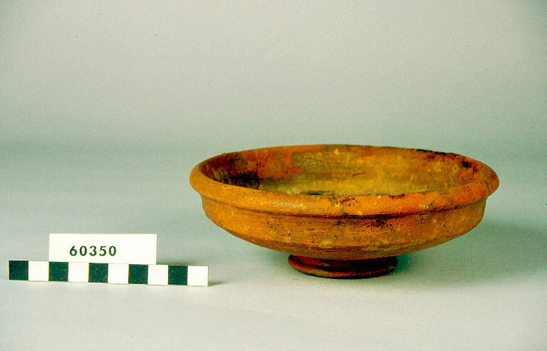 Coppa a pareti rialzate, vasca carenata, orlo esoverso, piede ad anello con scanalature, fondo ombelicato.