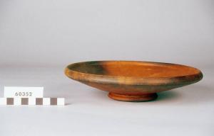 Patera con pareti leggermente arrotondate, orlo introflesso, piede con scanalature, fondo convesso.