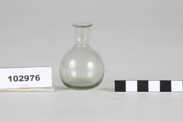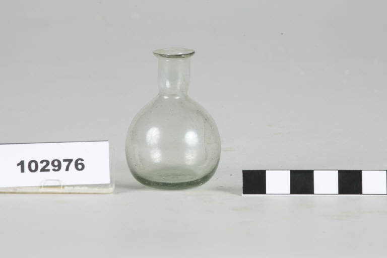 Balsamario di colore verdino a corpo globulare, bordo distinto, labbro estroflesso, collo cilindrico e ventre globoso.