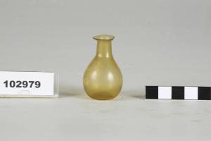 Balsamario di colore giallo, corpo piriforme, bordo distinto, labbro estroflesso, collo cilindrico, ventre conico.