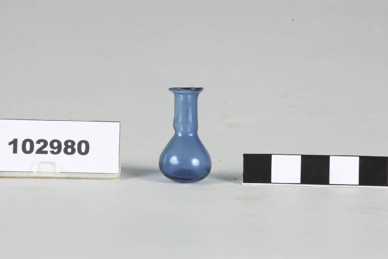 Balsamario in vetro trasparente a corpo piriforme, bordo distinto, labbro estroflesso, collo cilindrico leggermente bombato, fondo concavo.