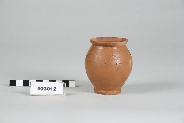 Olletta a corpo ovoidale, bordo distinto svasato, orlo arrotondato, piede a disco.
