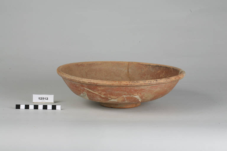 Patera in terra sigillata con orlo ingrossato, parete ricurva, vasca piuttosto profonda e piede ad anello.