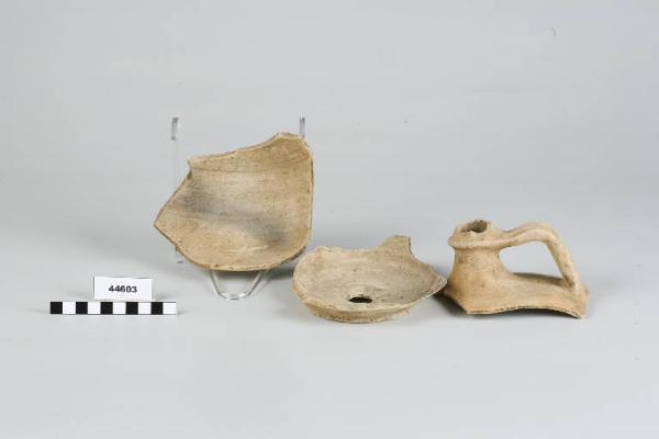 Tre frammenti di olpe a collarino, collo troncoconico, piede a disco.