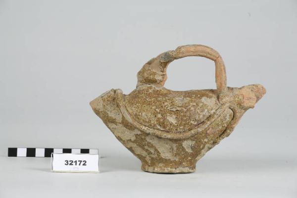Askos a forma di volatile, ansa impostata superiormente al corpo e piede a disco.