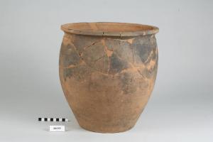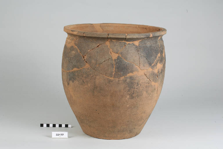 Urna ovoide con labbro estroflesso, orlo piatto, breve collo e fondo piano.