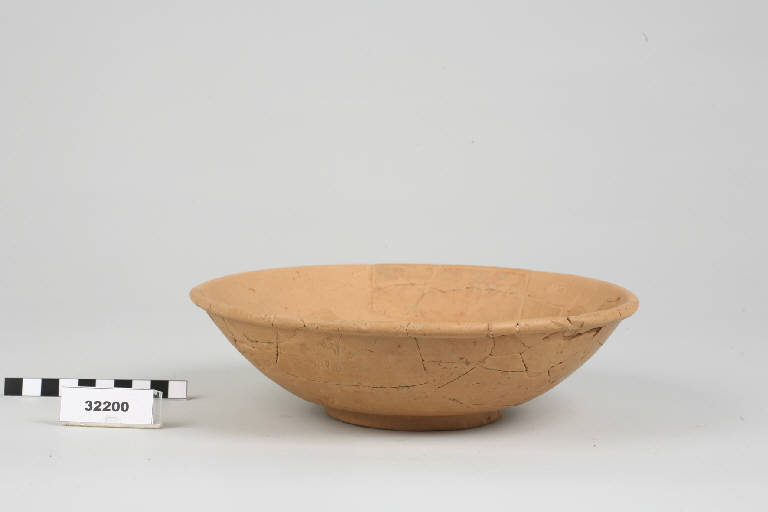 Patera in terra sigillata con orlo ingrossato, parete arrotondata e piede ad anello.